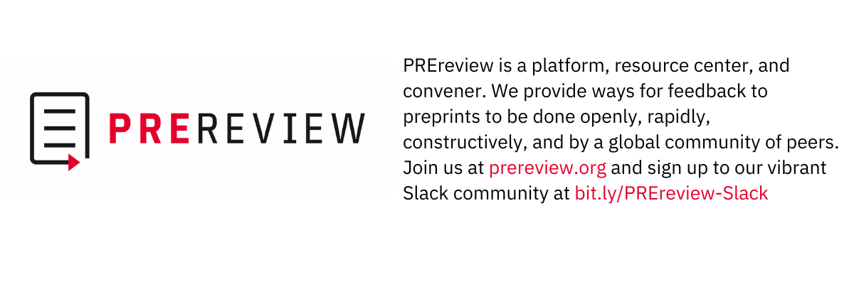 PREreview is a sponsored project of Code for Science & Society. Code for Science and Society is a registered US 501(c)(3) nonprofit. Donations are tax-deductible to the extent allowed by law in the US. Tax ID 81-3791683